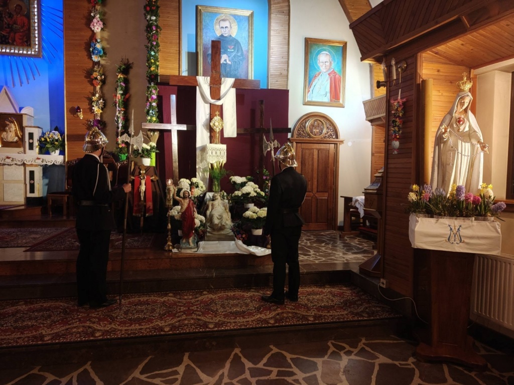 W Niedzielę Wielkanocną od godziny 5:00 pełniliśmy Honorową Wartę przy Grobie Pańskim w naszym Kościele Parafialnym. Warta wystawiana była do momentu rozpoczęcia mszy rezurekcyjnej.