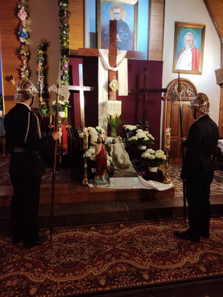 W Niedzielę Wielkanocną od godziny 5:00 pełniliśmy Honorową Wartę przy Grobie Pańskim w naszym Kościele Parafialnym. Warta wystawiana była do momentu rozpoczęcia mszy rezurekcyjnej.