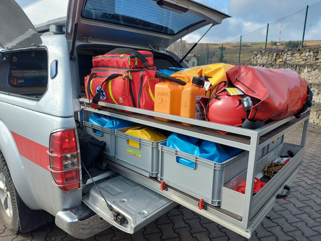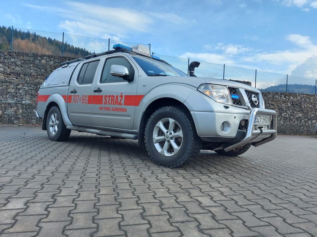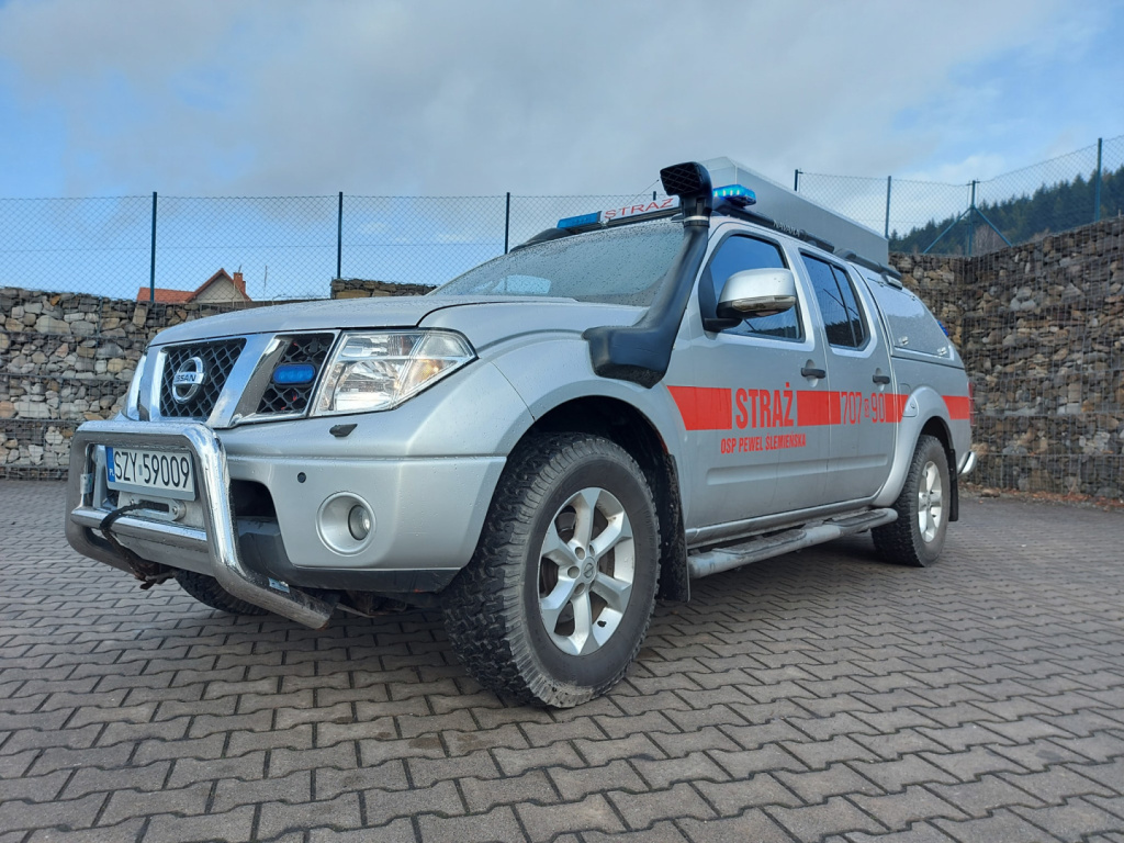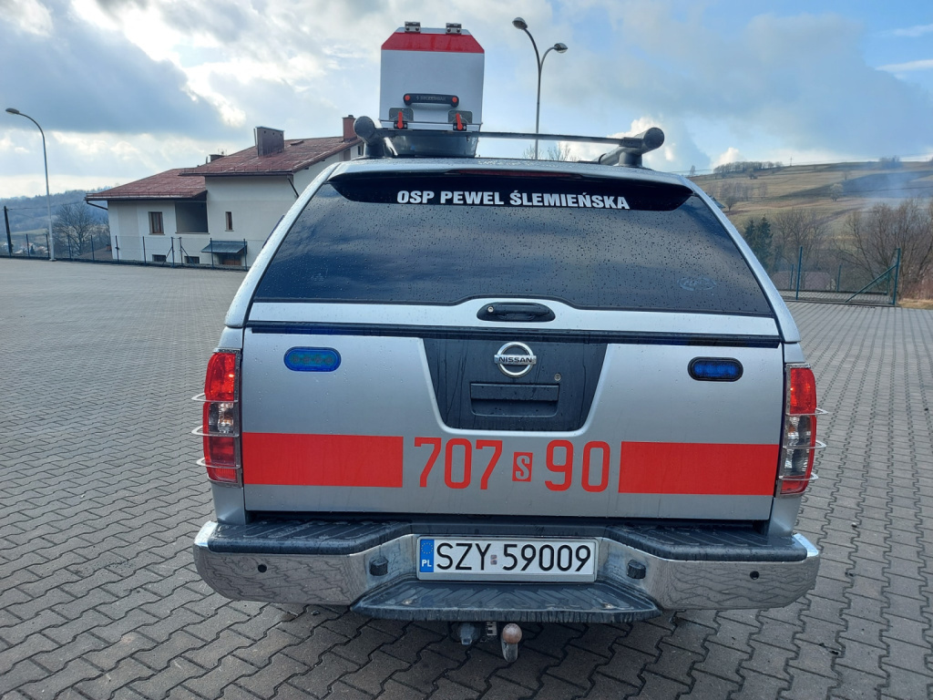 Na wyposażeniu pojazdu Nissan Navara znajduje się torba medyczna R1, radiotelefon przewoźny, pilarka, podręczny sprzęt burzący, tłumice, podnośnik Hi-lift, a także profesjonalny sprzęt do ratownictwa wysokościowego oraz trójnóg ratowniczy. Pojazd wyposażony jest w napęd 4x4, przystoswowany do przewozu pięciu strażaków. Rok produkcji 2008.